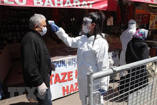 Người dân được kiểm tra thân nhiệt tại một khu chợ ở thủ đô Ankara, Thổ Nhĩ Kỳ. Ảnh minh hoạ: THX/TTXVN