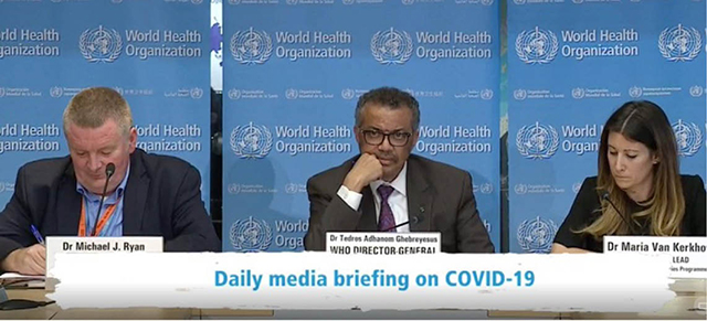 Tổng giám đốc WHO Tedros Adhanom Ghebreyesus (giữa) trong một cuộc họp báo về COVID-19. Ảnh: Vietnamtourism