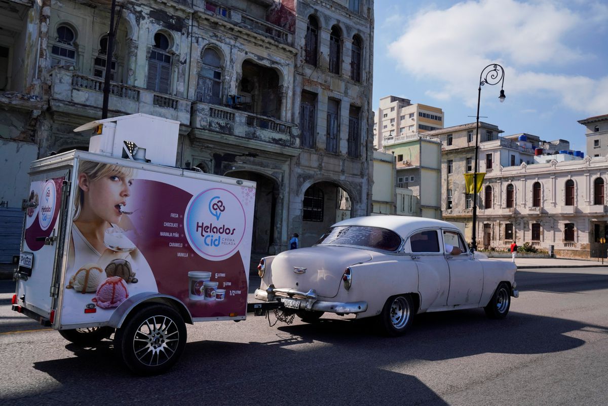 Một chiếc xe kéo theo rơ-mooc bán kem mang nhãn hiệu Helados Cid của anh em nhà Garcia trên đường phố thủ đô Havana. Ảnh: Reuters