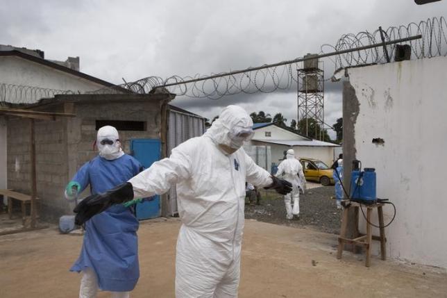 Một nhân viên y tế mặc trang phục bảo hộ được khử trùng ở Monrovia vào năm ngoái - Ảnh: Reuters