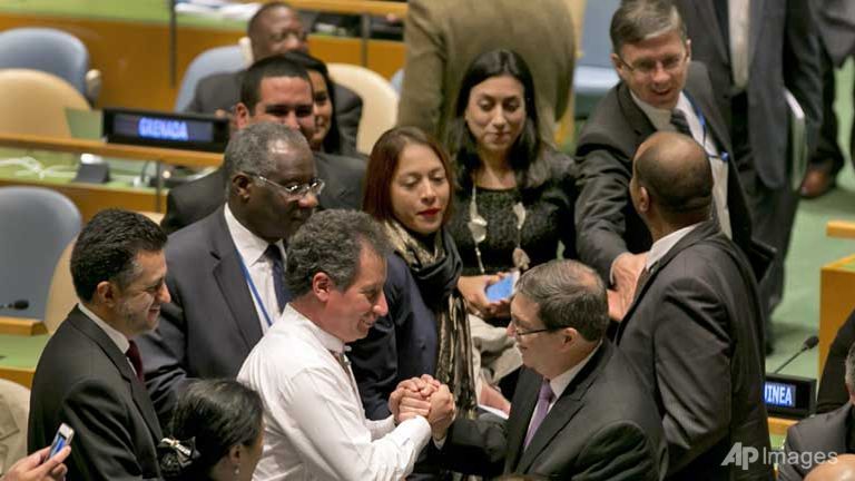 Năm ngoái, Hoa Kỳ và Israel đã bỏ phiếu chống lại nghị quyết này và 3 quốc gia: Quần đảo Marshall, Micronesia và Palau bỏ phiếu trắng. Nghị quyết năm nay hoan nghênh sự tái lập quan hệ ngoại giao của Mỹ-Cuba và công nhận thiện chí của Tổng thống Mỹ Barack Obama trong những nỗ lực đã và đang thực hiện để dỡ bỏ lệnh cấm vận.