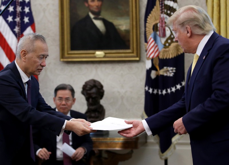 Phó Thủ tướng Trung Quốc Lưu Hạc đưa cho Tổng thống Trump bức thư của Chủ tịch Tập Cận Bình sau khi ông Trump thông báo về thỏa thuận thương mại "giai đoạn 1" với Trung Quốc ở Nhà Trắng ngày 11/10. Ảnh: Getty