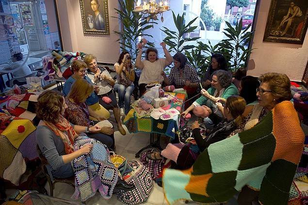 Nhóm phụ nữ ở Villaverde del Rio (Tây Ban Nha) hẹn tại quán cà phê góc phố để cùng đan len làm nhân đạo - Ảnh: AFP