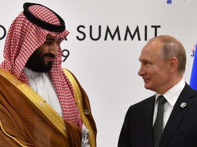 Tổng thống Nga Vladimir Putin bắt tay Thái tử Mohammed bin Salman của Saudi Arabia tại Hội nghị G20 ở Osaka (Nhật). Ảnh: PLO.