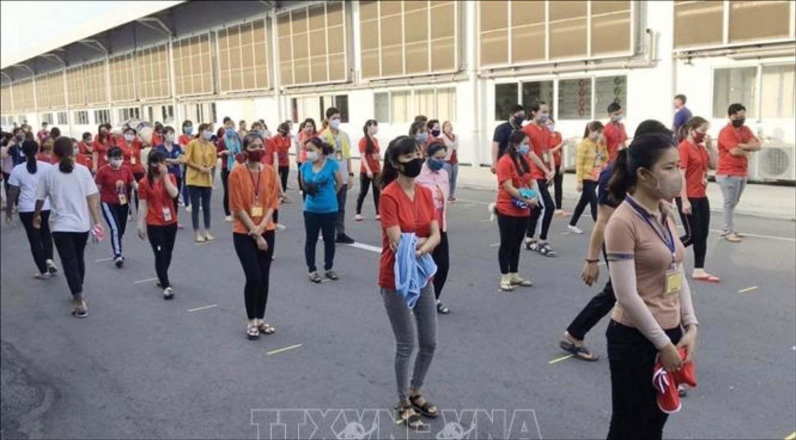 Công nhân tại một khu công nghiệp ở tỉnh An Giang trước khi vào chuyền sản xuất trong bối cảnh đại dịch COVID-19 bùng phát. Ảnh minh họa: TTXVN