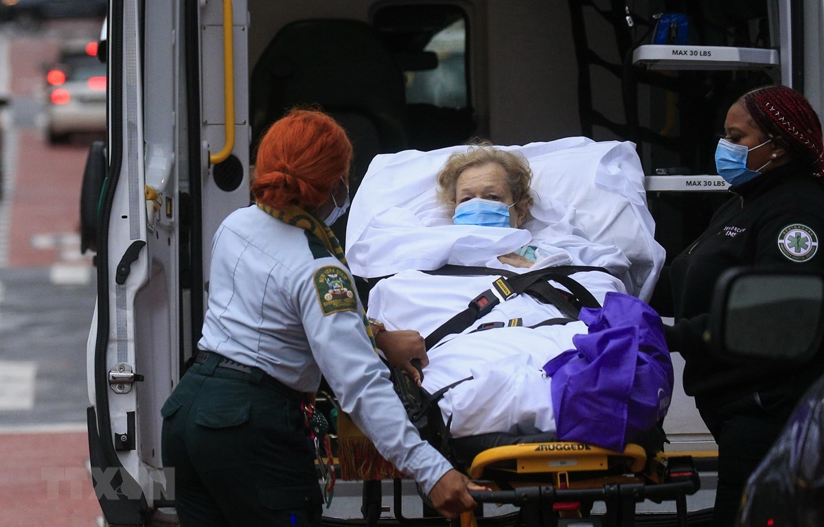 Chuyển bệnh nhân nhiễm COVID-19 tới bệnh viện Tisch ở New York, Mỹ. (Ảnh: AFP/TTXVN)