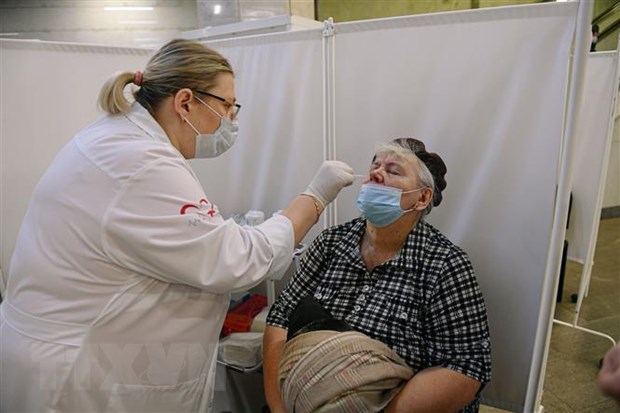 Nhân viên y tế lấy mẫu xét nghiệm COVID-19 cho người dân tại Moskva, Nga. (Ảnh: THX/TTXVN)