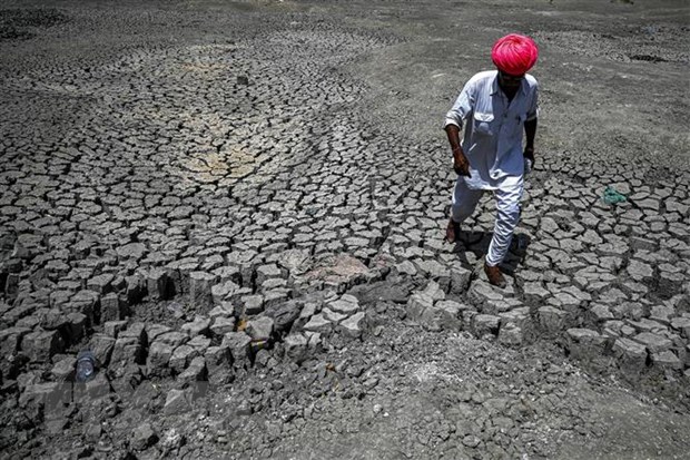 Lòng hồ khô cạn do hạn hán tại làng Bandai, huyện Pali, Ấn Độ, ngày 11/5/2022. Ảnh: AFP/TTXVN
