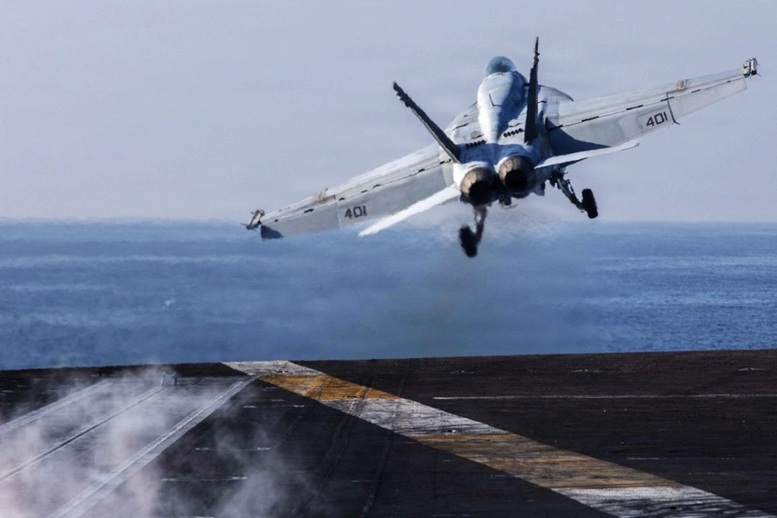 | Tiêm kích F/A-18E cất cánh từ tàu sân bay USS Abraham Lincoln ngày 28/2 - Ảnh: AFP |