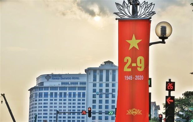 Băngrôn, ápphích tung bay bên cạnh những công trình của Hà Nội chào mừng kỷ niệm 75 năm Quốc khánh 2/9. (Ảnh: Thành Đạt/TTXVN)