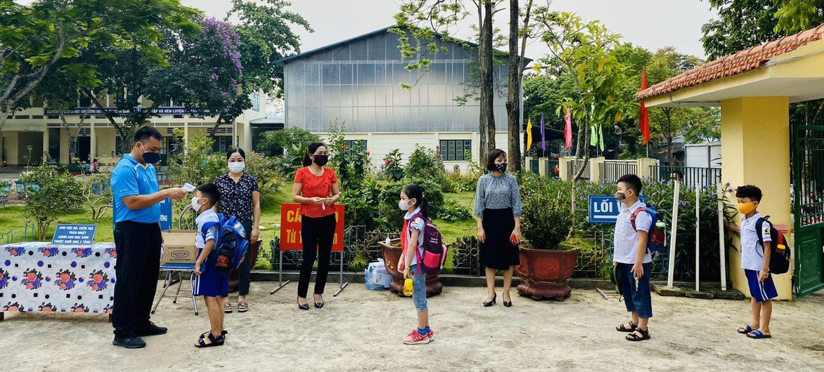 Học sinh một trường tiểu học ở Lào Cai được kiểm tra thân nhiệt trước khi vào lớp. Ảnh: UNICEF