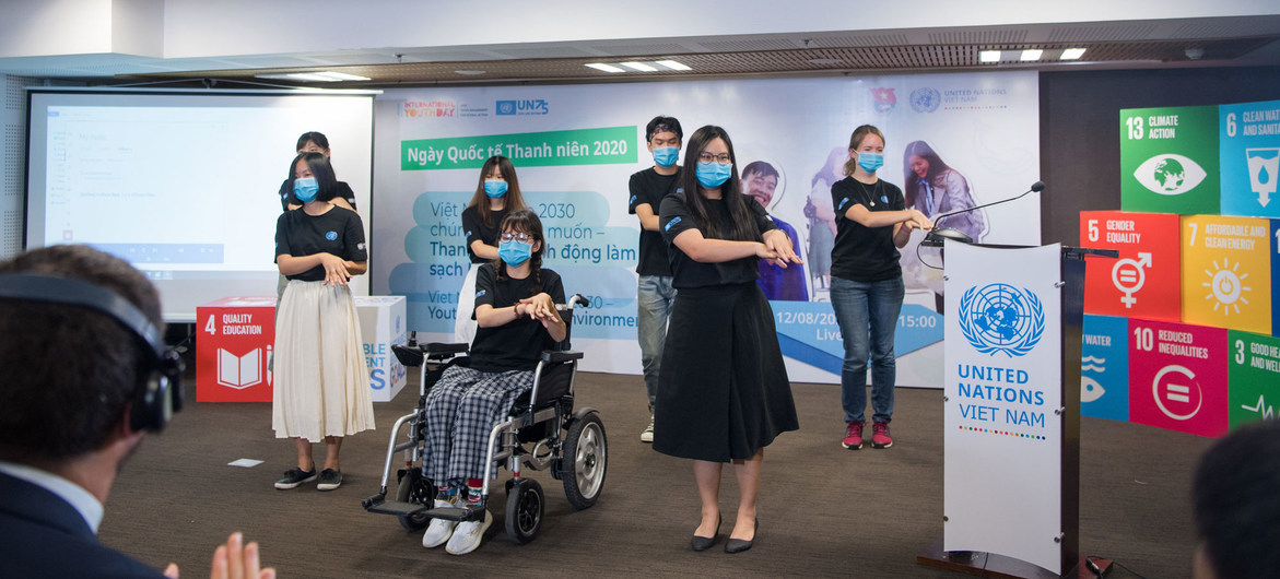 Thanh niên Việt Nam trình diễn một bài hát về COVID-19 trong Ngày Quốc tế Thanh niên 2020. Ảnh: UN Việt Nam/Nguyễn Đức Hiếu
