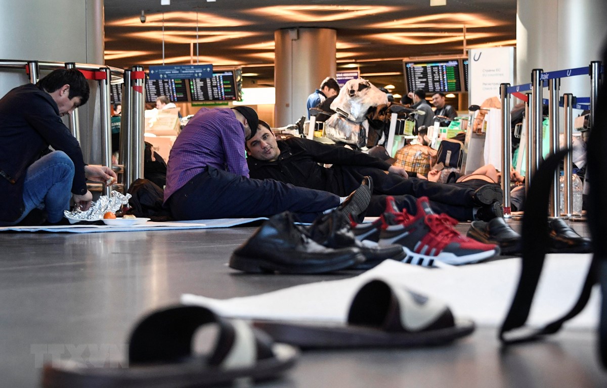 Hành khách mắc kẹt tại sân bay Vnukovo ở Moskva ngày 24/3/2020 sau khi Nga dừng các chuyến bay do lo ngại dịch COVID-19. (Ảnh: AFP/TTXVN)