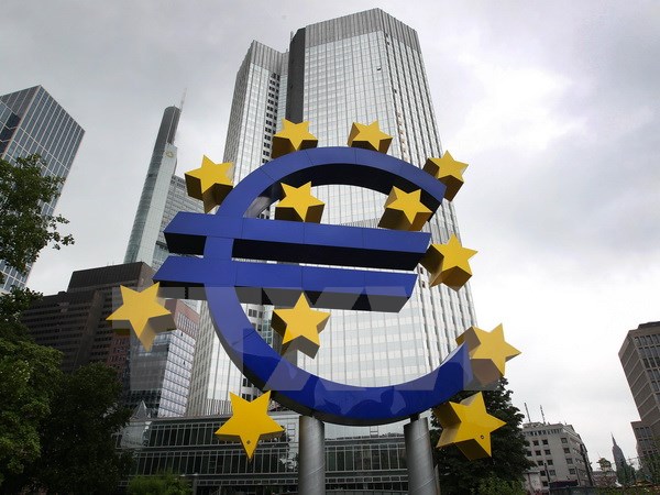 Logo đồng euro phía trước trụ sở Ngân hàng Trung ương châu Âu ECB ở Frankfurt am Main, miền tây nước Đức ngày 20/7. (Nguồn: AFP/TTXVN)