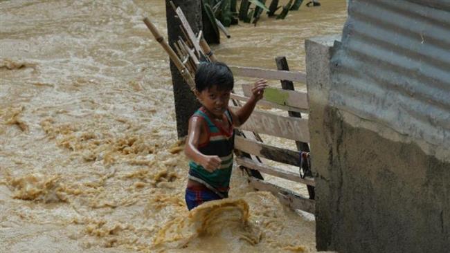 Trẻ em mạo hiểm lội qua dòng nước lũ tại một ngôi làng ở thị trấn Santa Rosa, phía bắc Manila, Philippines. Ảnh: AFP