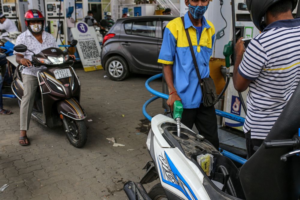 Người đi xe máy xếp hàng đổ xăng tại Bengaluru, Ấn Độ. Ảnh: Bloomberg