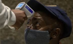 Một cảnh sát được đo thân nhiệt trong chiến dịch sàng lọc nCoV quy mô lớn ở Johannesburg, Nam Phi, hồi tháng 5. Ảnh: AP