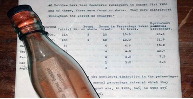 Chai thủy tinh chứa bức thư này nằm trong số hơn 1.000 chai được nhà khoa học người Anh George Parker Bidder thả xuống từ bờ biển Bắc năm 1906 nhằm thực hiện nghiên cứu về các dòng hải lưu, được vợ chồng bà Marianne Winkler - một nhân viên bưu chính đã nghỉ hưu của Đức tìm thấy vào năm 2015 tại đảo Amrun, sau hành trình dài 108 năm, 4 tháng và 18 ngày lênh đênh trên biển.