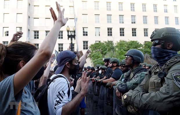 Cảnh sát Mỹ được triển khai gần Nhà Trắng ở Washington DC., ngày 3/6/2020 nhằm ngăn người quá khích trong cuộc biểu tình phản đối phân biệt chủng tộc. Nguồn: AFP/TTXVN