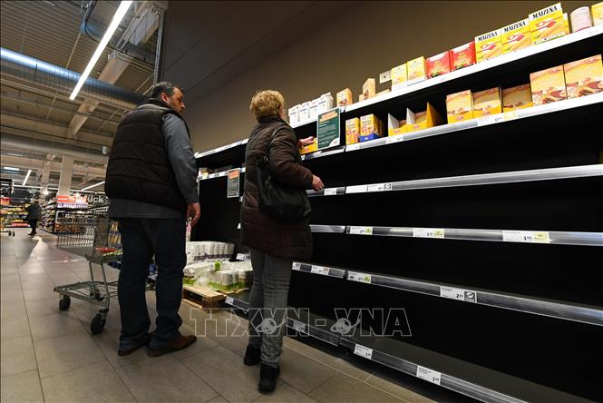 Những kệ hàng trống rỗng trong một siêu thị ở Frankfurt - Đức do thiếu nguồn cung hàng hoá. Ảnh: THX/TTXVN