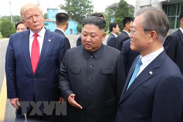 Tổng thống Donald Trump, Chủ tịch Kim Jong-un và Tổng thống Moon Jae-in trong cuộc gặp tại khu phi quân sự giữa hai miền ngày 30/6. Ảnh: TTXVN.