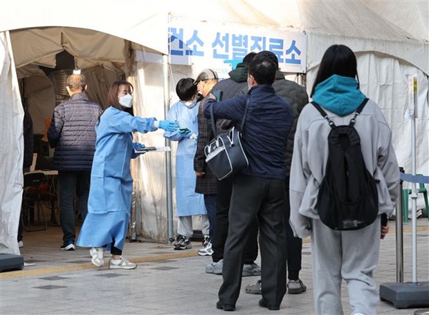 Nhân viên y tế hướng dẫn người dân tại điểm xét nghiệm COVID-19 ở Seoul, Hàn Quốc, ngày 21/11/2022. Ảnh: Yonhap/TTXVN