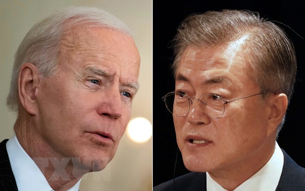 Tổng thống Mỹ Joe Biden (trái) và Tổng thống Hàn Quốc Moon Jae-in (phải). (Ảnh: AFP/TTXVN)