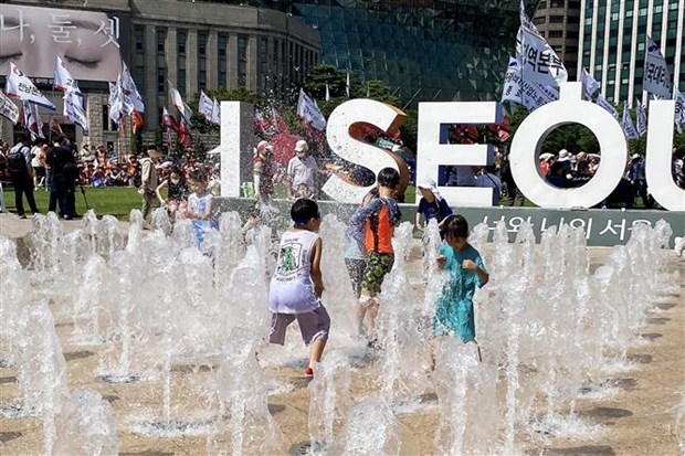 Trẻ em tìm đến đài phun nước để hạ nhiệt dưới thời tiết nắng nóng tại Hàn Quốc. Ảnh minh họa: TTXVN