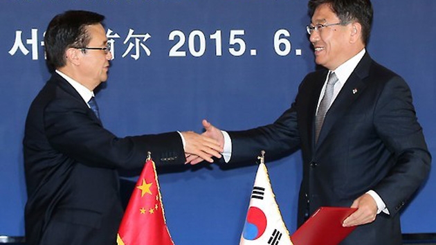 Đại diện Trung Quốc và Hàn Quốc trong buổi ký kết FTA năm 2015. Ảnh: Nhandan