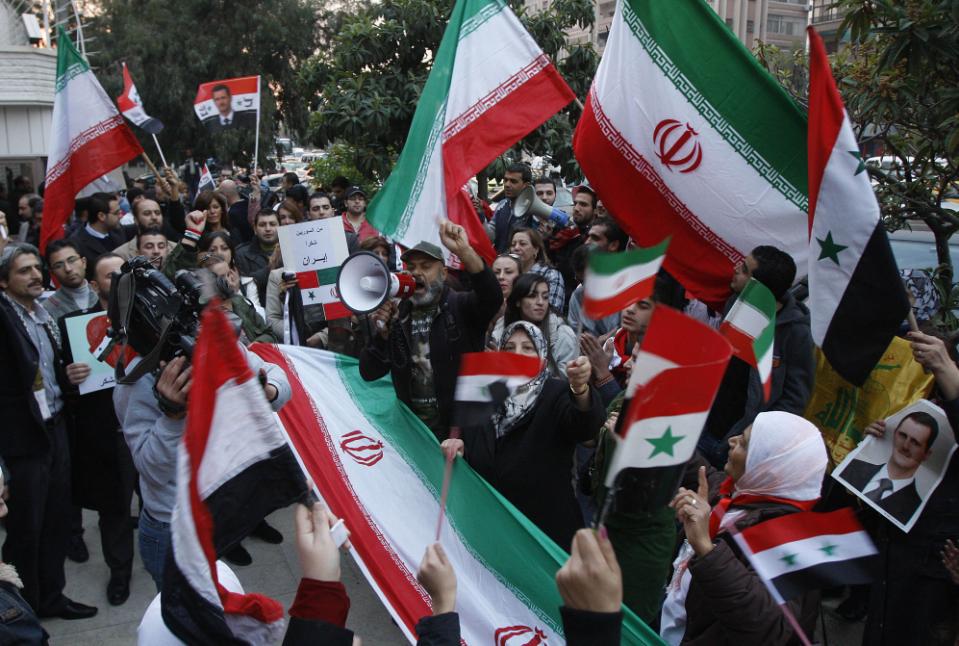 Những người ủng hộ Chính phủ Syria hô vang khẩu hiệu và vẫy cờ Iran-Syria trước Đại sứ quán Tehran để hoan nghênh sự ủng hộ của nước này tại Syria. Ảnh: AP