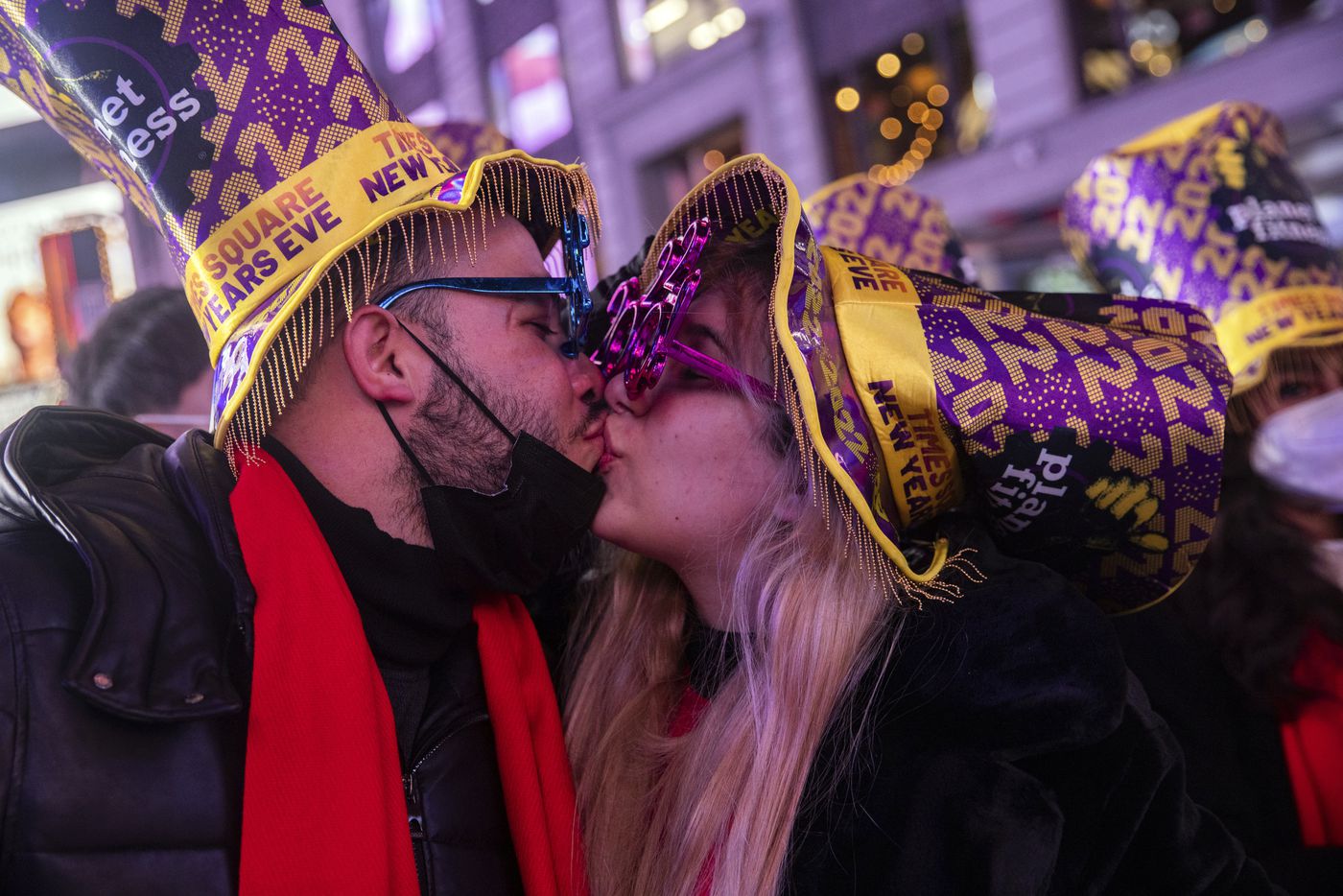 Một cặp đôi trao nhau nụ hôn ngọt ngào ở Quảng trường Thời đại trong thời khắc chuyển giao giữa năm cũ và năm mới. Ảnh: AP