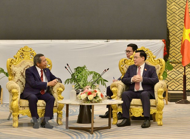 Chủ tịch Quốc hội Vương Đình Huệ tiếp Bộ trưởng Bộ Công nghệ và Truyền thông, Chủ tịch Hội hữu nghị Lào-Việt Nam Boviengkham Vongdara. (Ảnh: TTXVN)