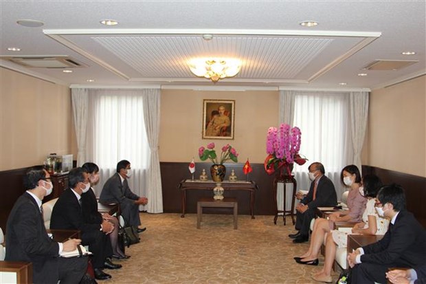 Đại sứ Vũ Hồng Nam tiếp ông Satou Takashi, Chủ tịch Công ty TNHH Advance - một doanh nghiệp của Nhật Bản đã hỗ trợ người Việt Nam gặp khó khăn vì dịch COVID-19 thông qua AVIJ, hồi tháng 9/2021. (Ảnh: Đức Thịnh-TTXVN)
