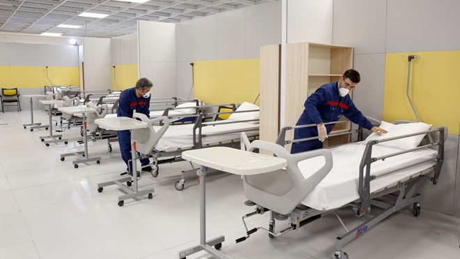 Nhân viên y tế dọn giường bệnh chuẩn bị đón bệnh nhân COVID-19 tại Tehran. Ảnh: AFP.
