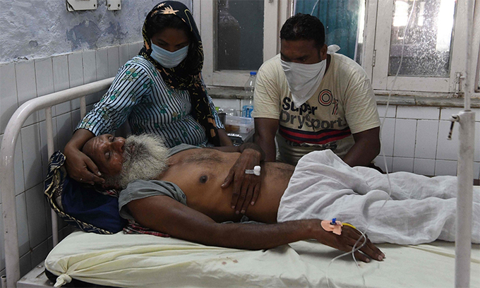Thân nhân chăm sóc một người ngộ độc vì uống rượu lậu tại huyện Tarn Taran, bang Punjab, Ấn Độ, ngày 1/8. Ảnh: AFP
