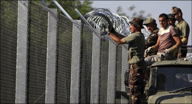 Binh sĩ Hungary gắn dây thép gai vào hàng rào trên biên giới với Croatia. Ảnh: Reuters