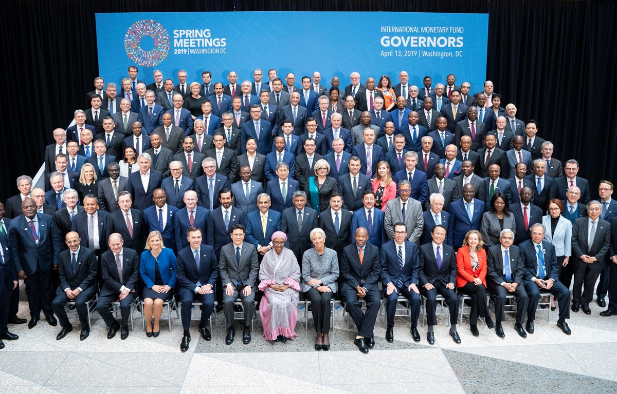Các đại biểu chụp ảnh lưu niệm tại Hội nghị mùa Xuân 2019 của Quỹ Tiền tệ quốc tế (IMF) và Ngân hàng Thế giới (WB) diễn ra ở Washington (Mỹ), ngày 13/4/2019. Ảnh: AFP/TTXVN