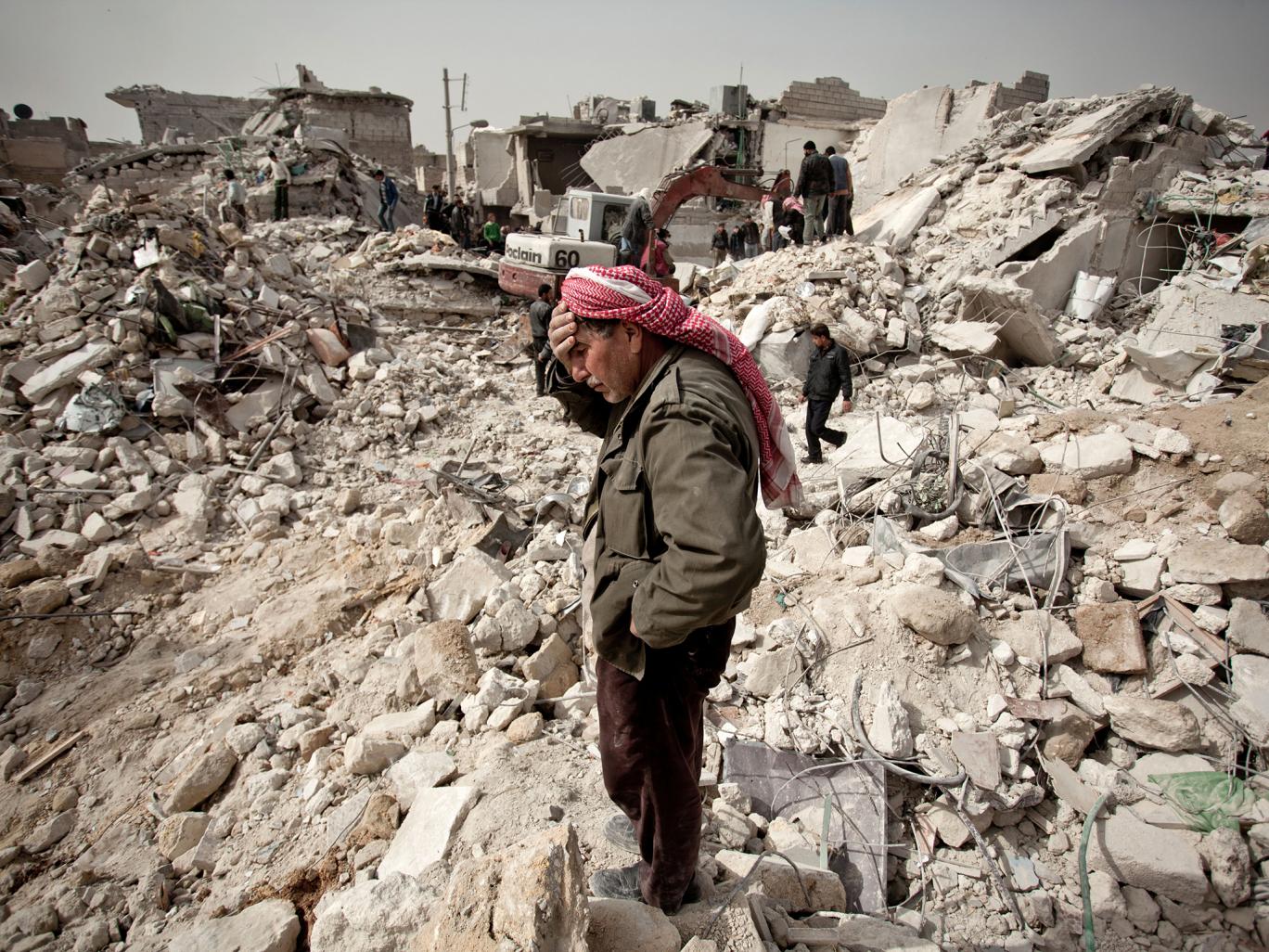 Người dân Syria bên cạnh đống đổ nát sau các cuộc tấn công. Ảnh: Independent.