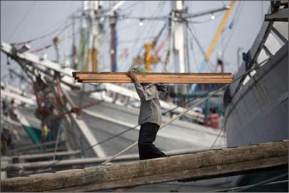 Một người lao động vận chuyển gỗ tại cảng Sunda Kelapa ở Jakarta (Indonesia). Ảnh: Reuters