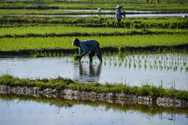 Nông dân làm việc trên cánh đồng lúa ở Japakeh, gần Banda Aceh, Indonesia. (Ảnh: AFP/TTXVN)