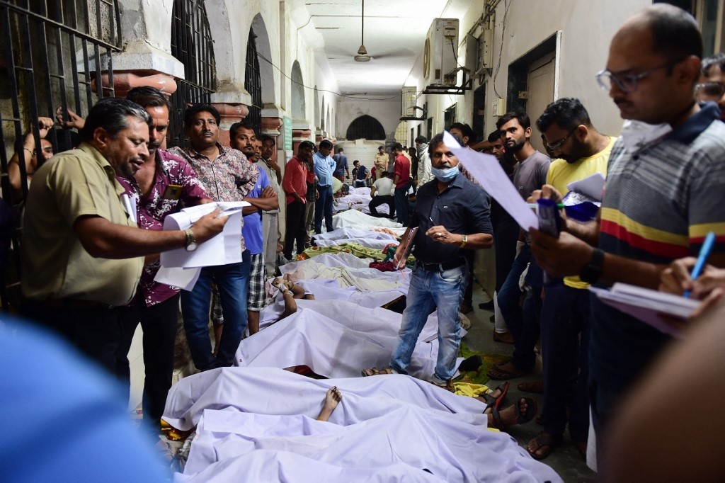 Thi thể các nạn nhân vụ sập cầu treo được đặt tại một bệnh viện ở Morbi. AFP