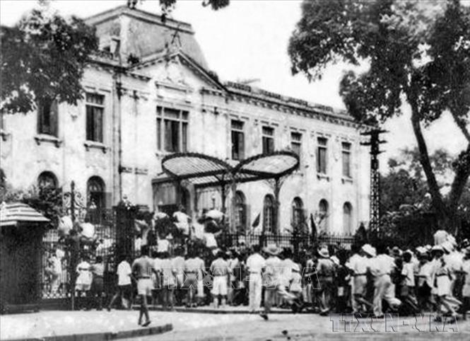 Quần chúng cách mạng và tự vệ chiến đấu chiếm Bắc Bộ phủ trong Cách mạng Tháng Tám (19/8/1945). Ảnh: Tư liệu TTXVN