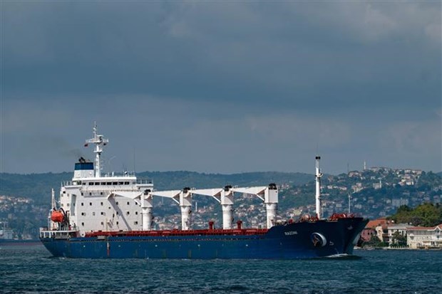 Tàu chở ngũ cốc của Ukraine di chuyển dọc Eo biển Bosphorus, ngày 3/8/2022. (Ảnh: AFP/TTXVN)