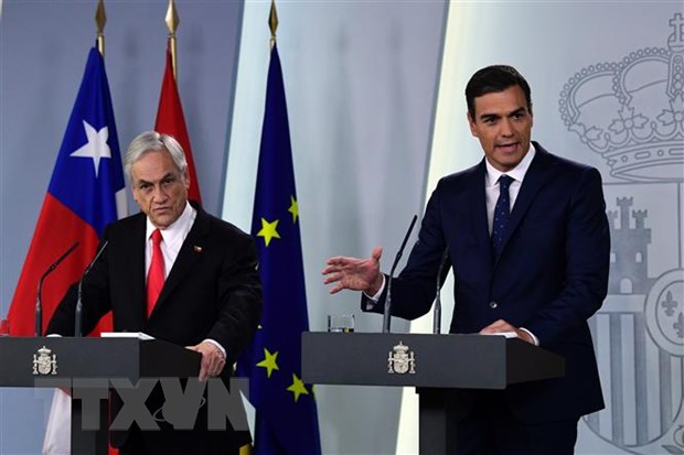 Tổng thống Chile Sebastian Pinera (trái) và người đồng cấp Tây Ban Nha Pedro Sanchez tại một cuộc họp báo ở Madrid. Ảnh: AFP/TTXVN