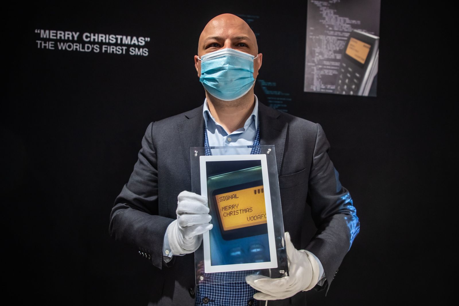 SMS đầu tiên trên thế giới được “đóng gói” trong khung kỹ thuật số tại cuộc đấu giá ở Paris ngày 21/12/2021. Ảnh: EPA Photo