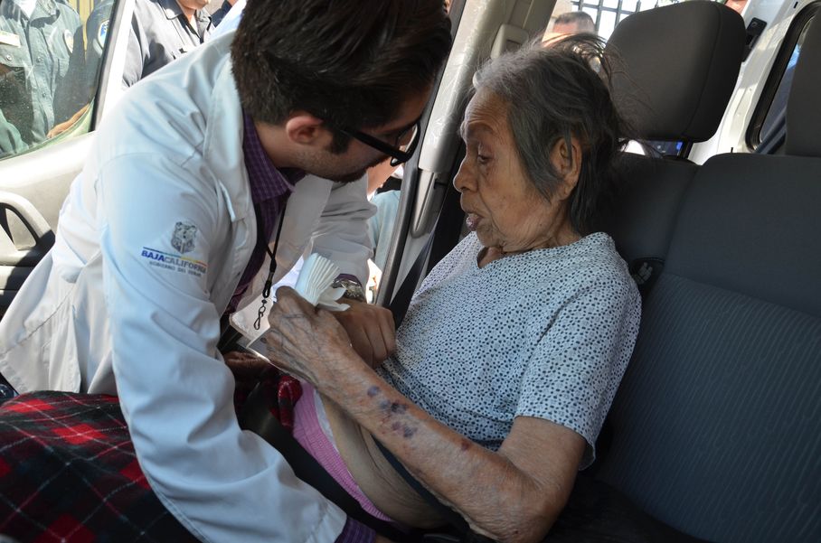 Nhân viên y tế chăm sóc một cụ bà sau khi được di tản từ viện dưỡng lão đang bốc cháy ở Mexicali, Mexico - Ảnh: AP