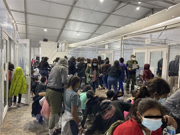 Người di cư nghỉ tạm tại một cơ sở của Cơ quan Bảo vệ Biên giới và Hải quan Mỹ ở Donna, bang Texas. Ảnh: AFP/TTXVN