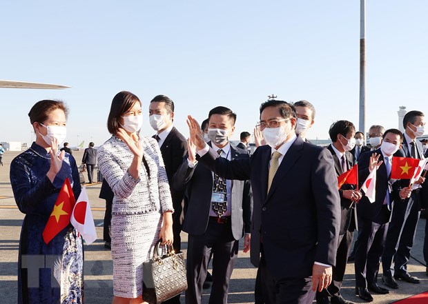 Thủ tướng Chính phủ Phạm Minh Chính tạm biệt các đại biểu tiễn đoàn tại Sân bay quốc tế Haneda (Tokyo). (Ảnh: Dương Giang/TTXVN)