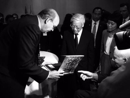 Tổng Bí thư Nguyễn Phú Trọng gặp gỡ các cựu chiến binh từ cuộc chiến tranh Việt Nam trong buổi tiệc tại Washington D.C., do ĐSQ Việt Nam tổ chức.