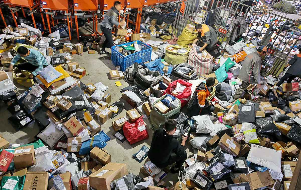 Phân loại các gói hàng tại một công ty giao hàng ở Giang Tô, Trung Quốc. Ảnh: AFP